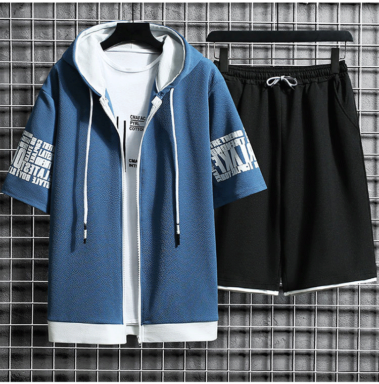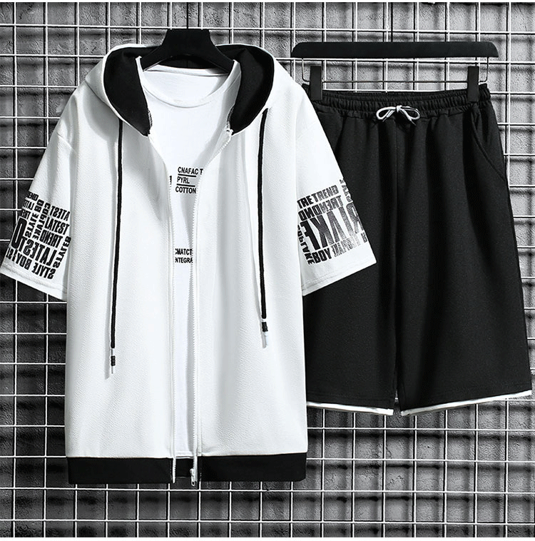 후드 반팔 코트 × 반바지  여름철에 활약하는 세트,항상 산뜻하고 쾌적. 1세트₩37,900;2세트₩49,900